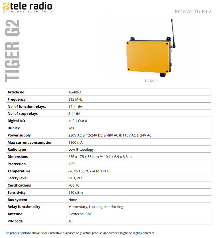 • TG-R9-2 Tiger G2, 915 MHz, receiver, 12 function relays SIL3, PLe ,TELE-RADIO