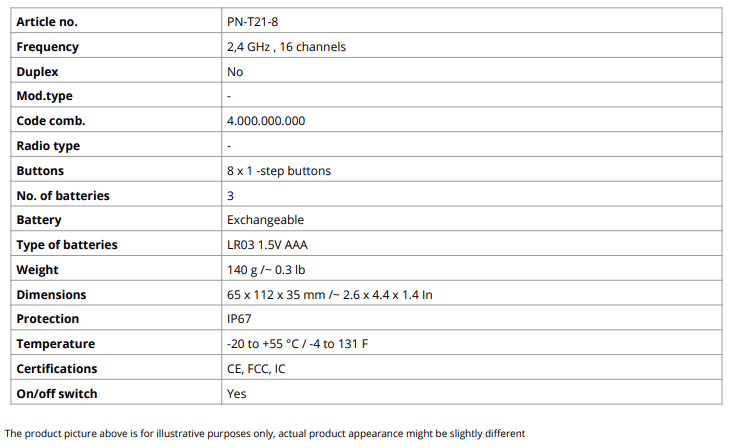 Frequency 2,4 GHz 16 channelsBattery ExchangeableProtection IP67Certifications CE, FCC, IC